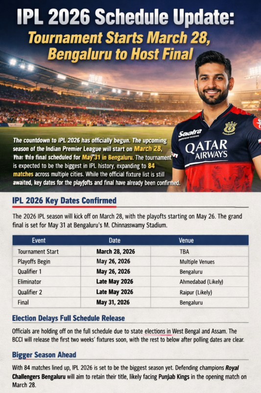 The countdown to IPL 2026 has officially begun. The upcoming season of the Indian Premier League will start on March 28, with the final scheduled for May 31 in Bengaluru. The tournament is expected to be the biggest in IPL history, expanding to 84 matches across multiple cities. While the official fixture list is still awaited, key dates for the playoffs and final have already been confirmed.